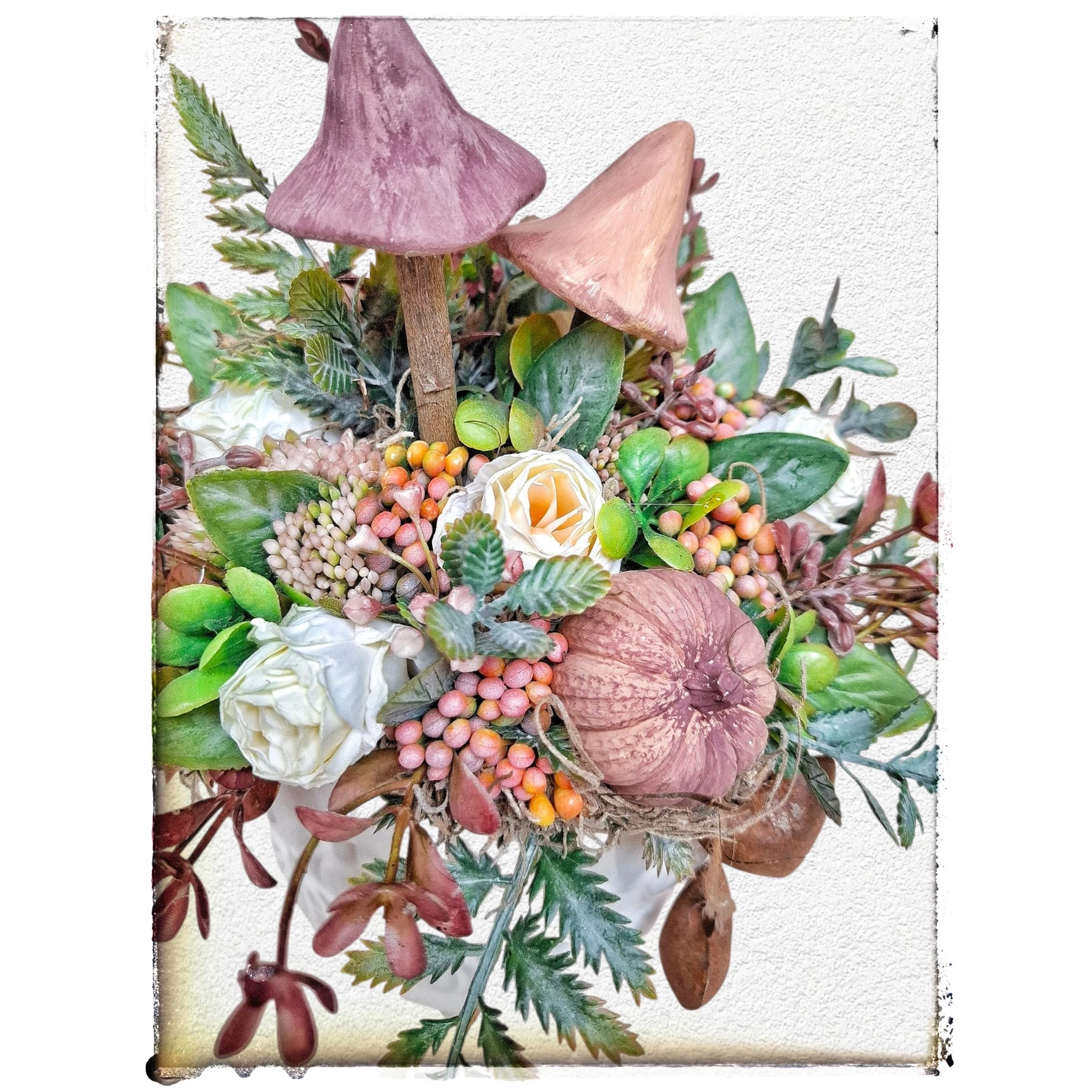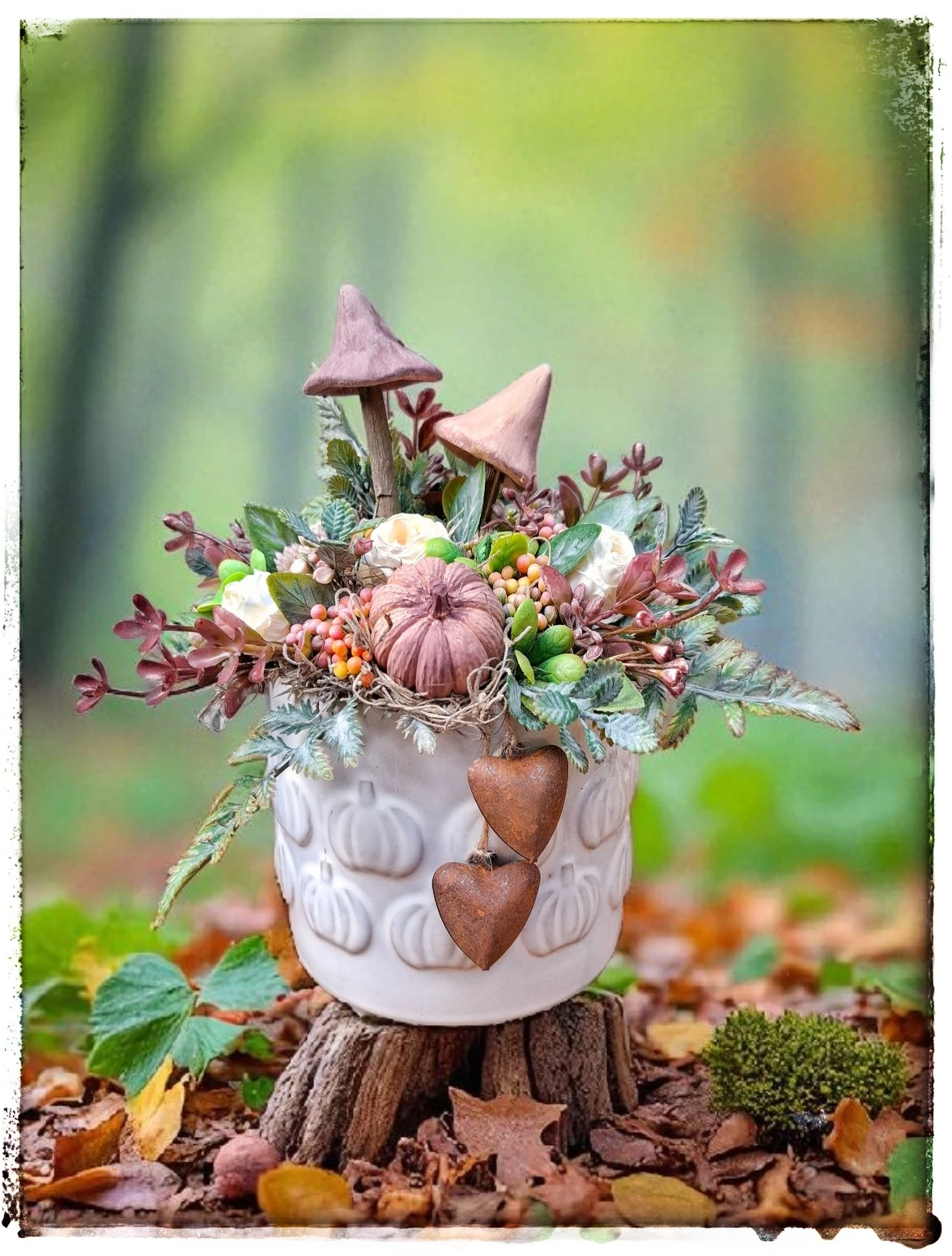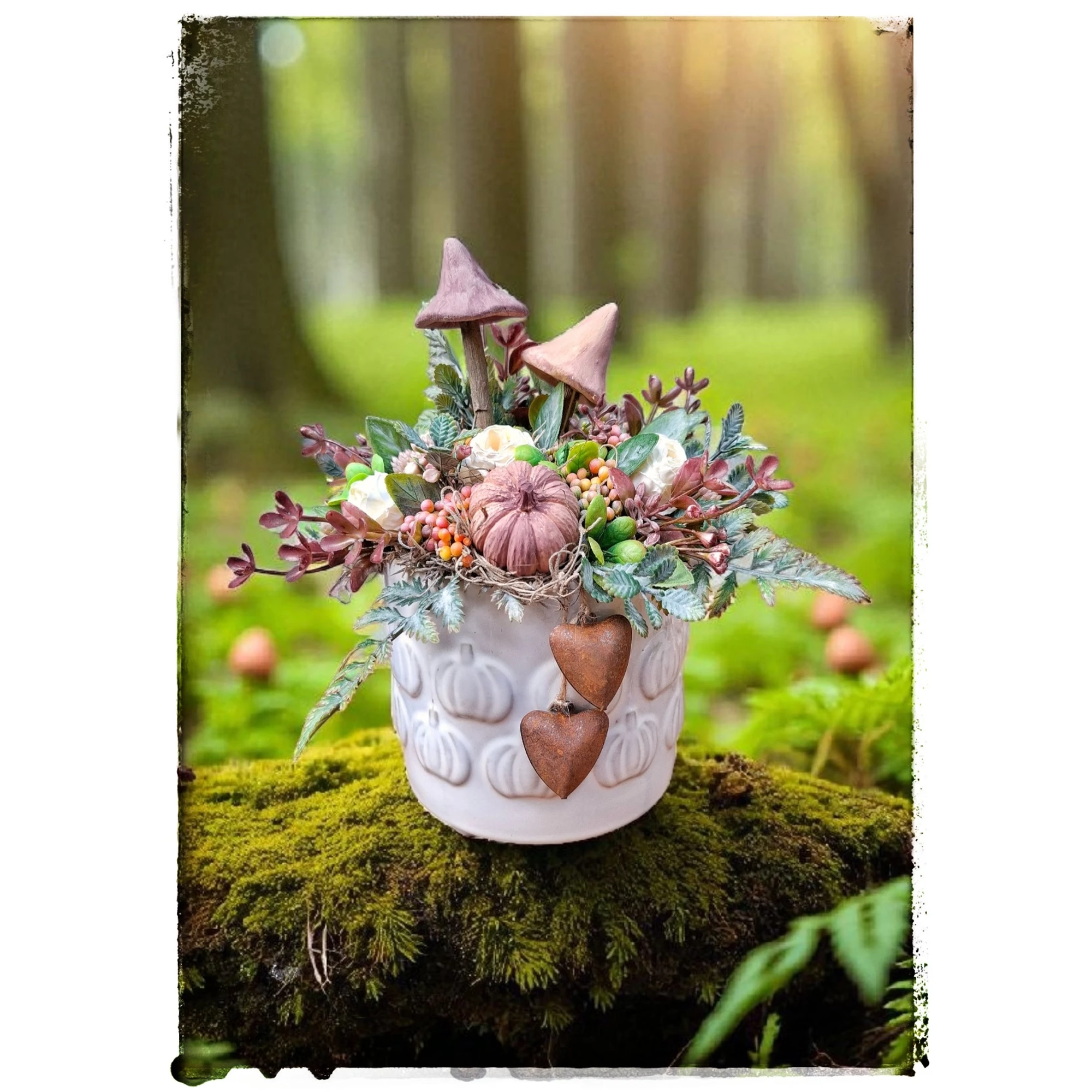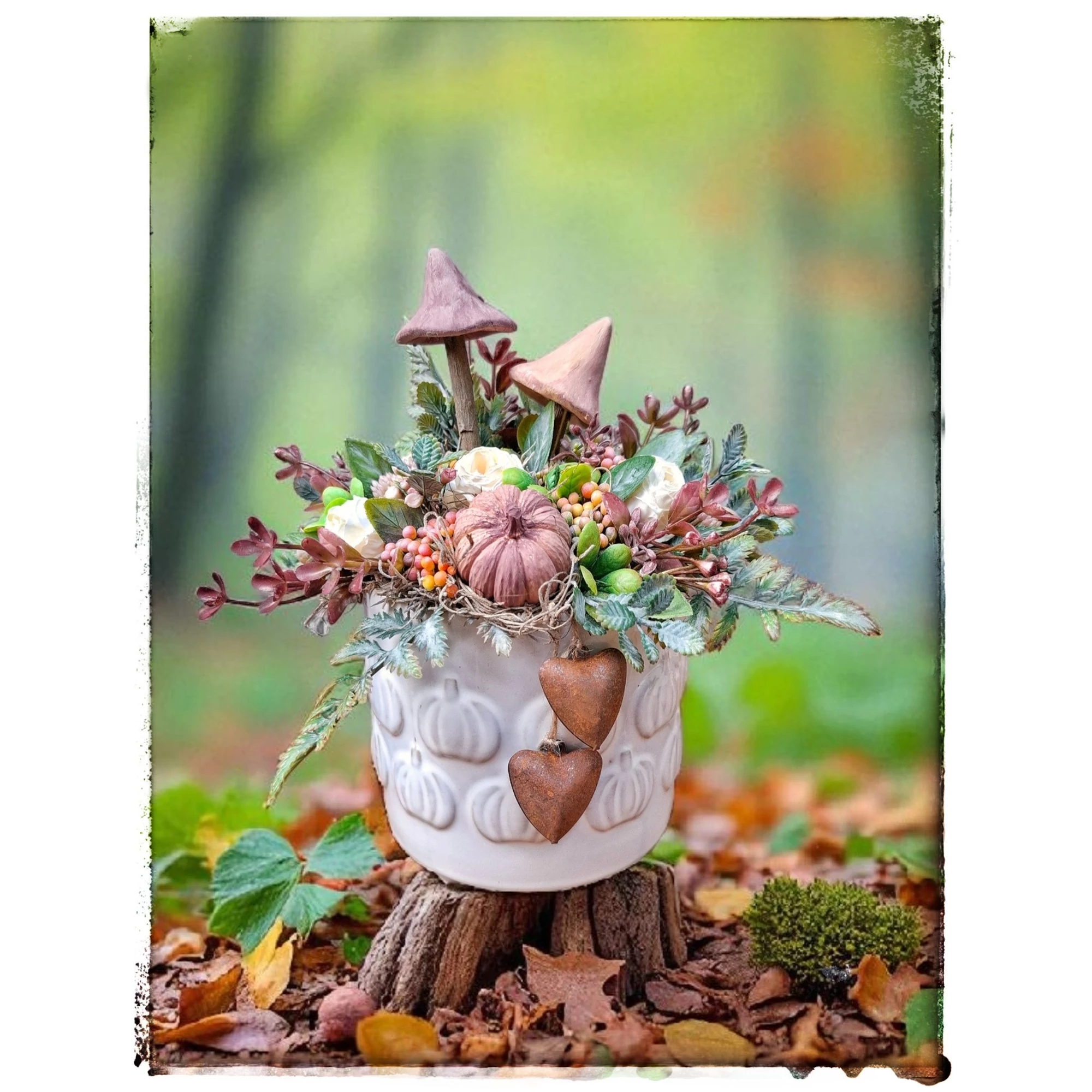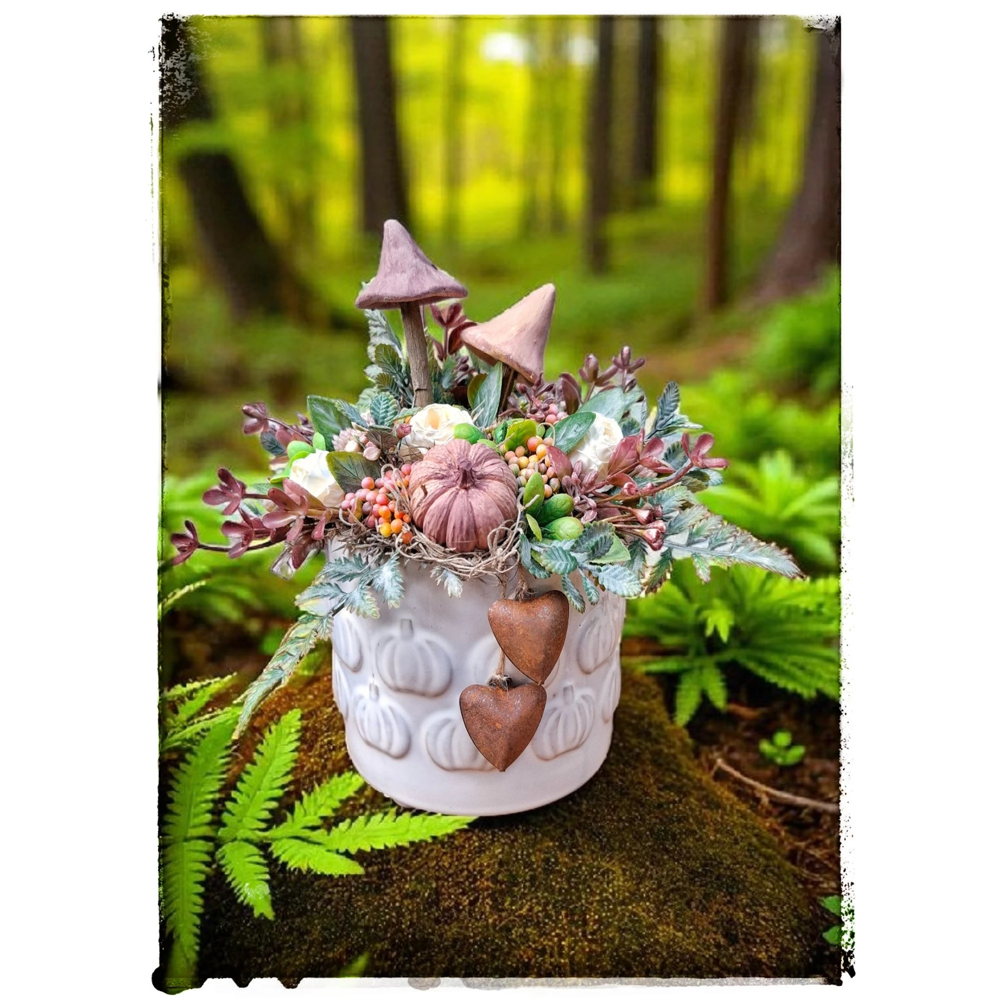 Őszi kerámia kaspóba készült vintage hangulatban ez a dekoráció. Hamvas levelekkel, bogyós elemekkel, mályvás színvilágban , kézműves gombákkal.