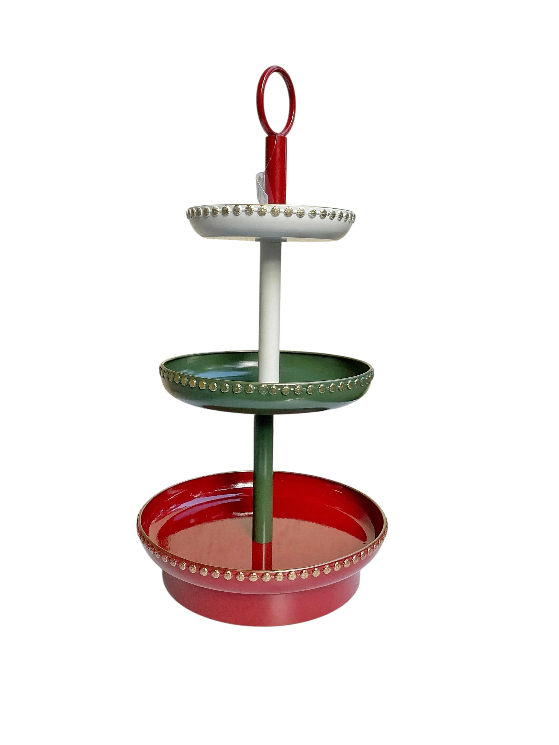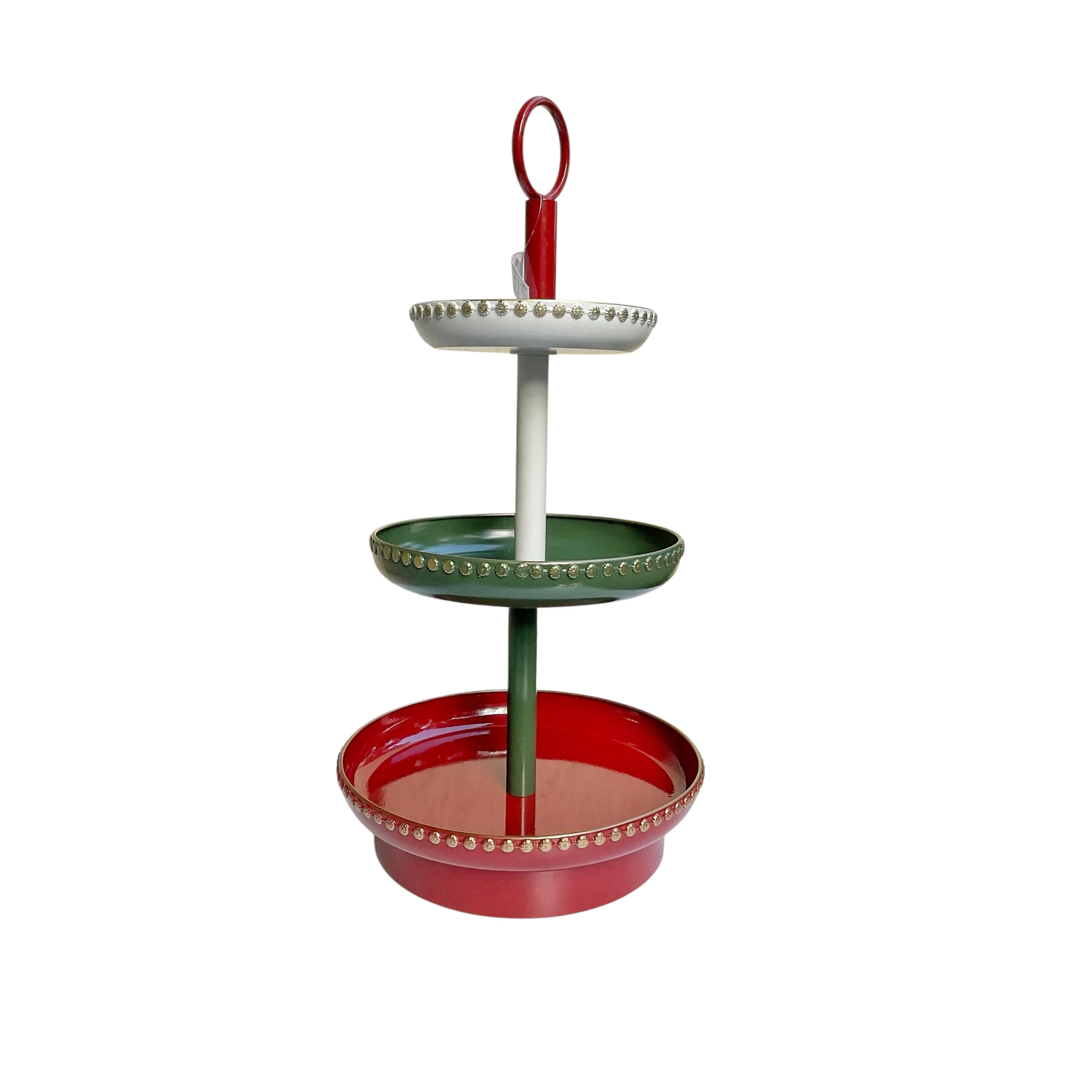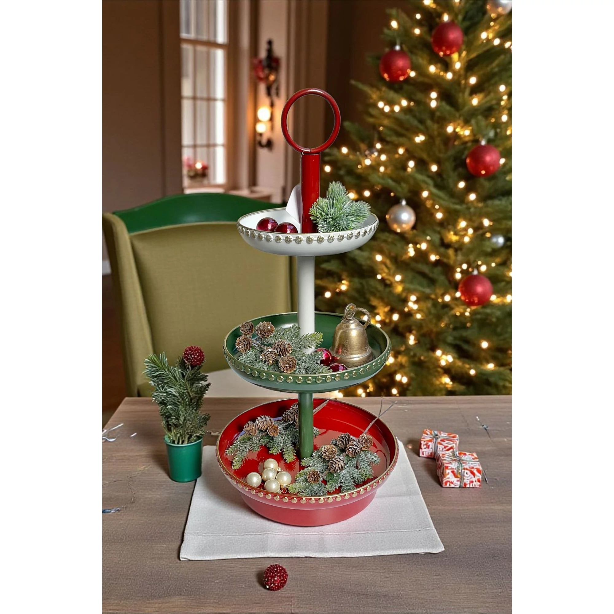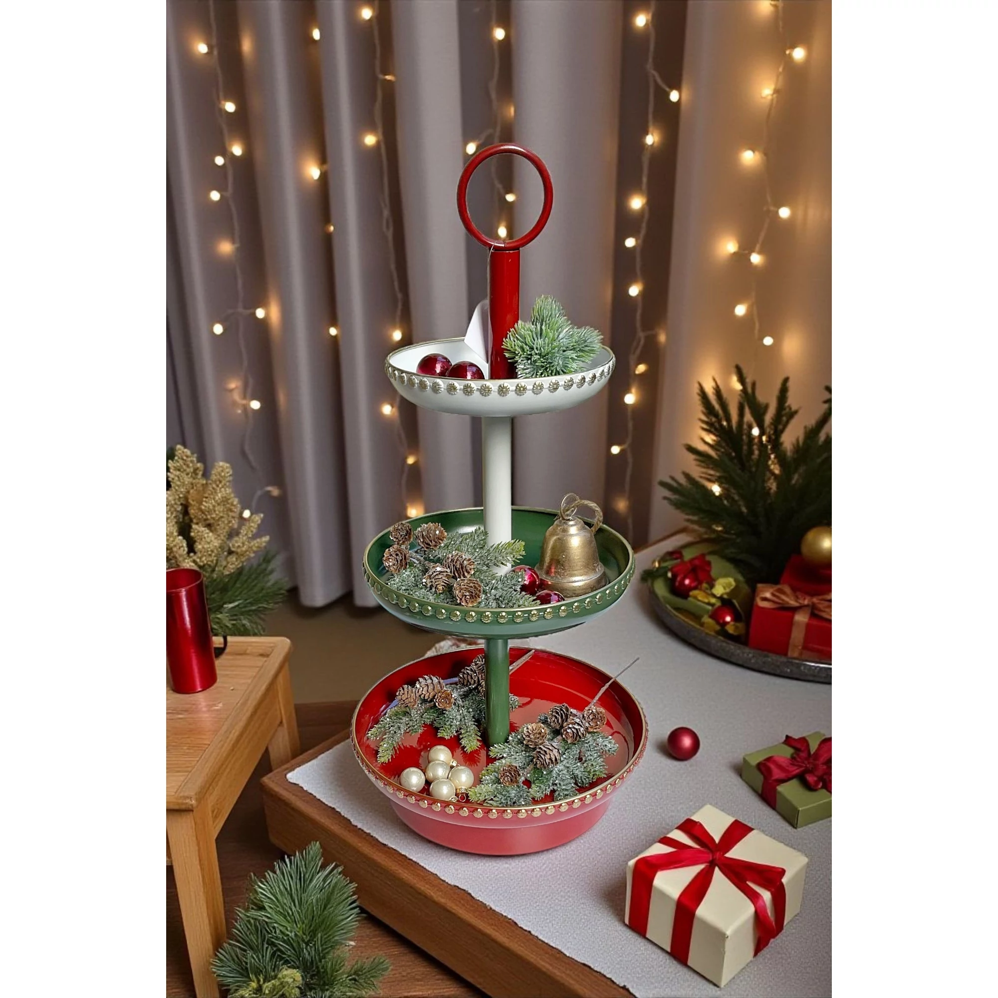 Ez a gyönyörű, karácsonyi hangulatot idéző, háromszintes fém kínáló tál tökéletes választás ünnepi asztalodra. A piros, zöld és fehér színek elegáns kombinációja arany szegéllyel díszítve igazán ünnepivé varázsolja a tálalást. Praktikus kialakításának köszönhetően sütemények, gyümölcsök, apró falatkák vagy más finomságok tálalására is ideális, és garantáltan a karácsonyi dekoráció egyik kedvenc darabja lesz.