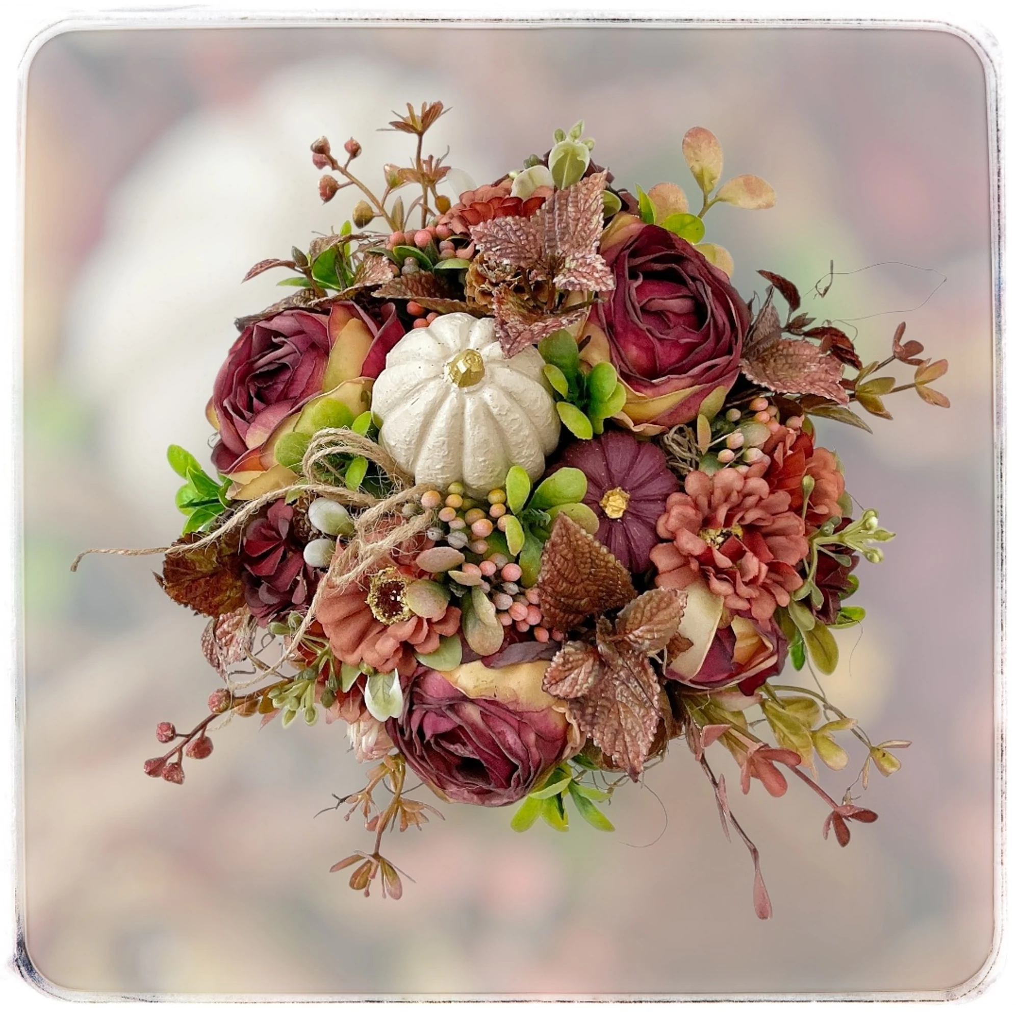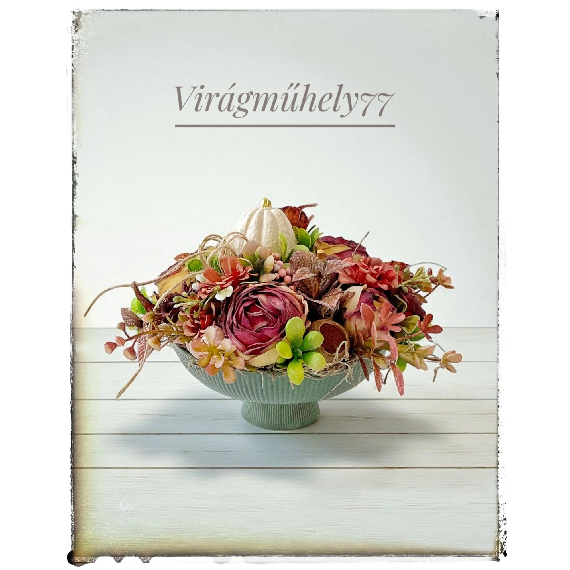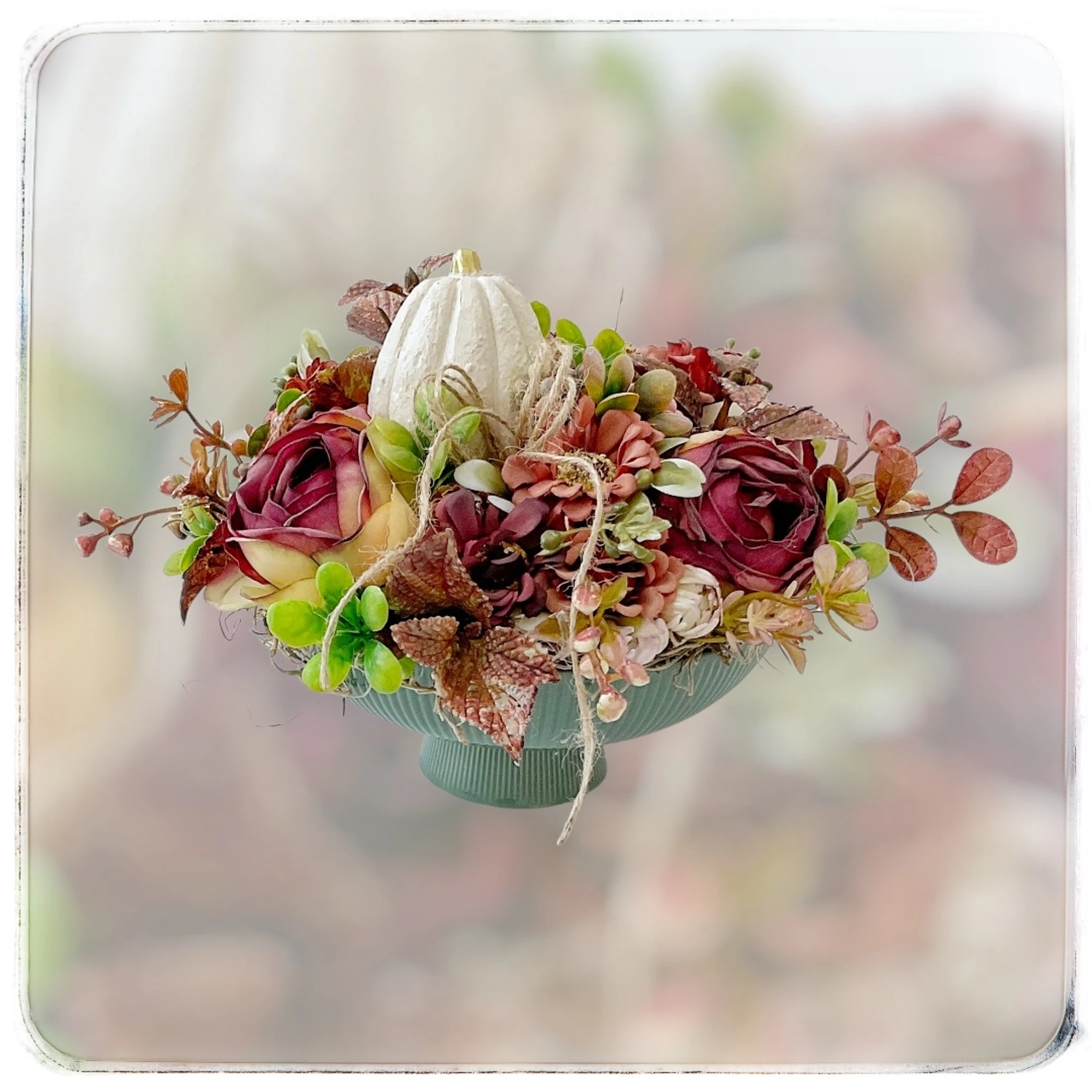 Varázsolj otthonodba meghitt őszi hangulatot ezzel a különleges, kézzel készült dekorációval! A gyönyörű, bordázott kerámia tálon elhelyezett kompozíció kerámia tökökkel, elegáns művirágokkal és levelekkel készült, így tökéletesen ötvözi a modern stílust az őszi természet színeivel.