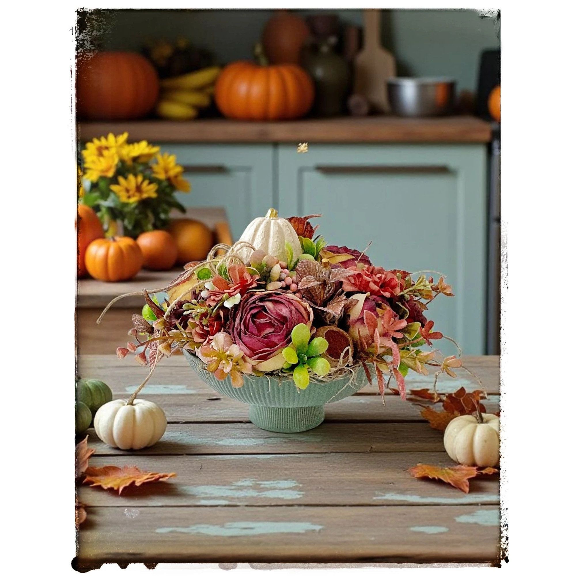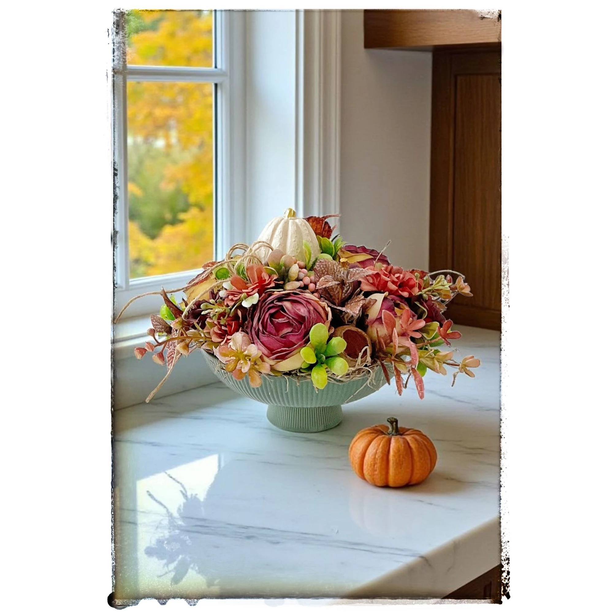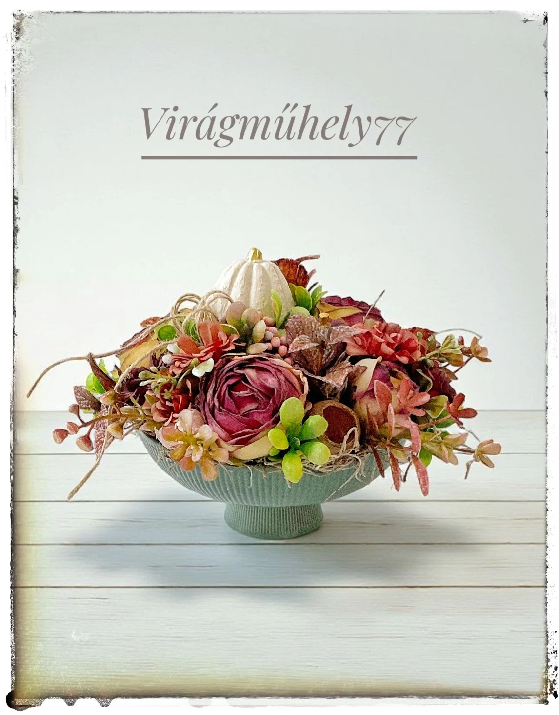 Varázsolj otthonodba meghitt őszi hangulatot ezzel a különleges, kézzel készült dekorációval! A gyönyörű, bordázott kerámia tálon elhelyezett kompozíció kerámia tökökkel, elegáns művirágokkal és levelekkel készült, így tökéletesen ötvözi a modern stílust az őszi természet színeivel.