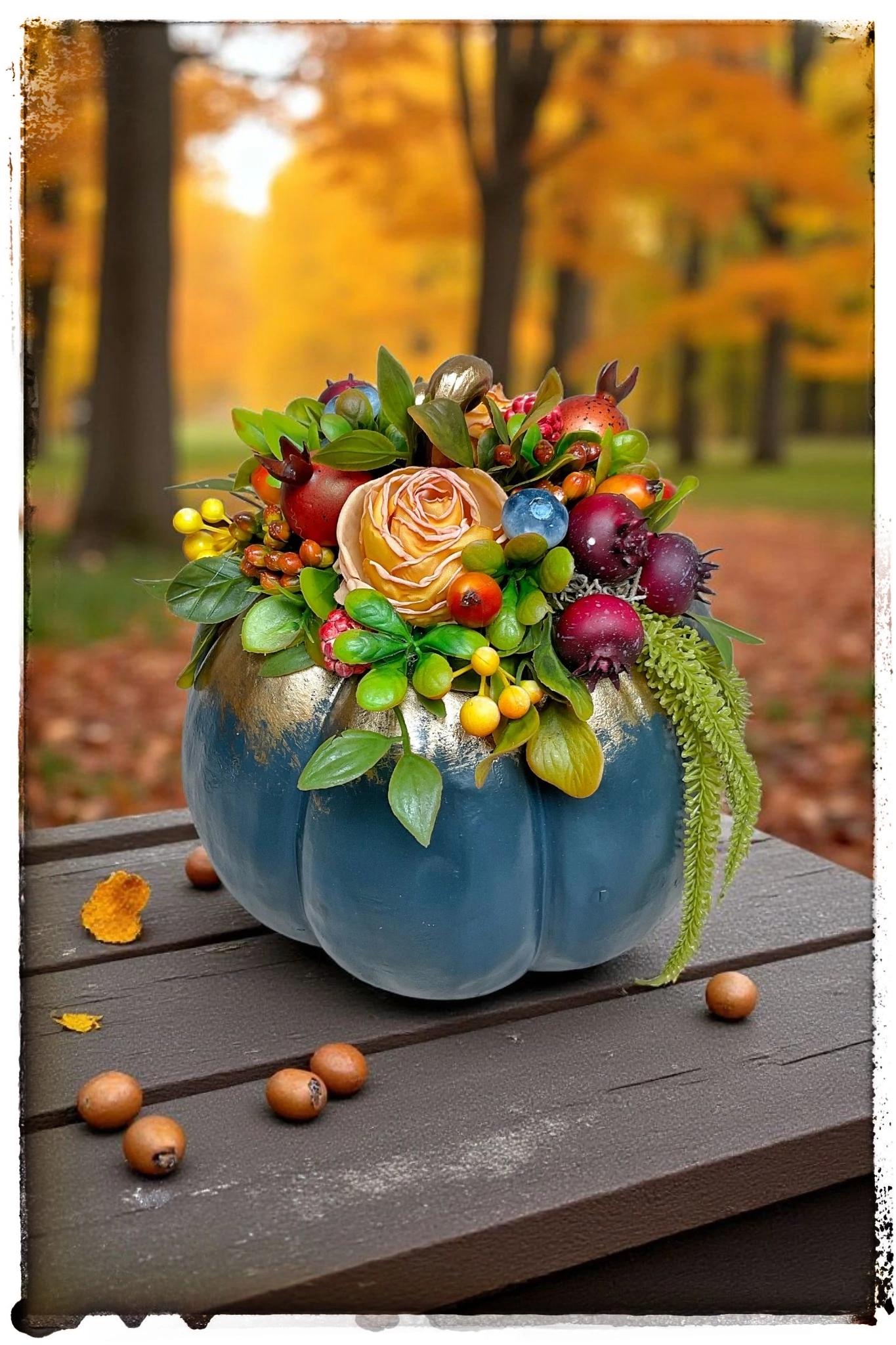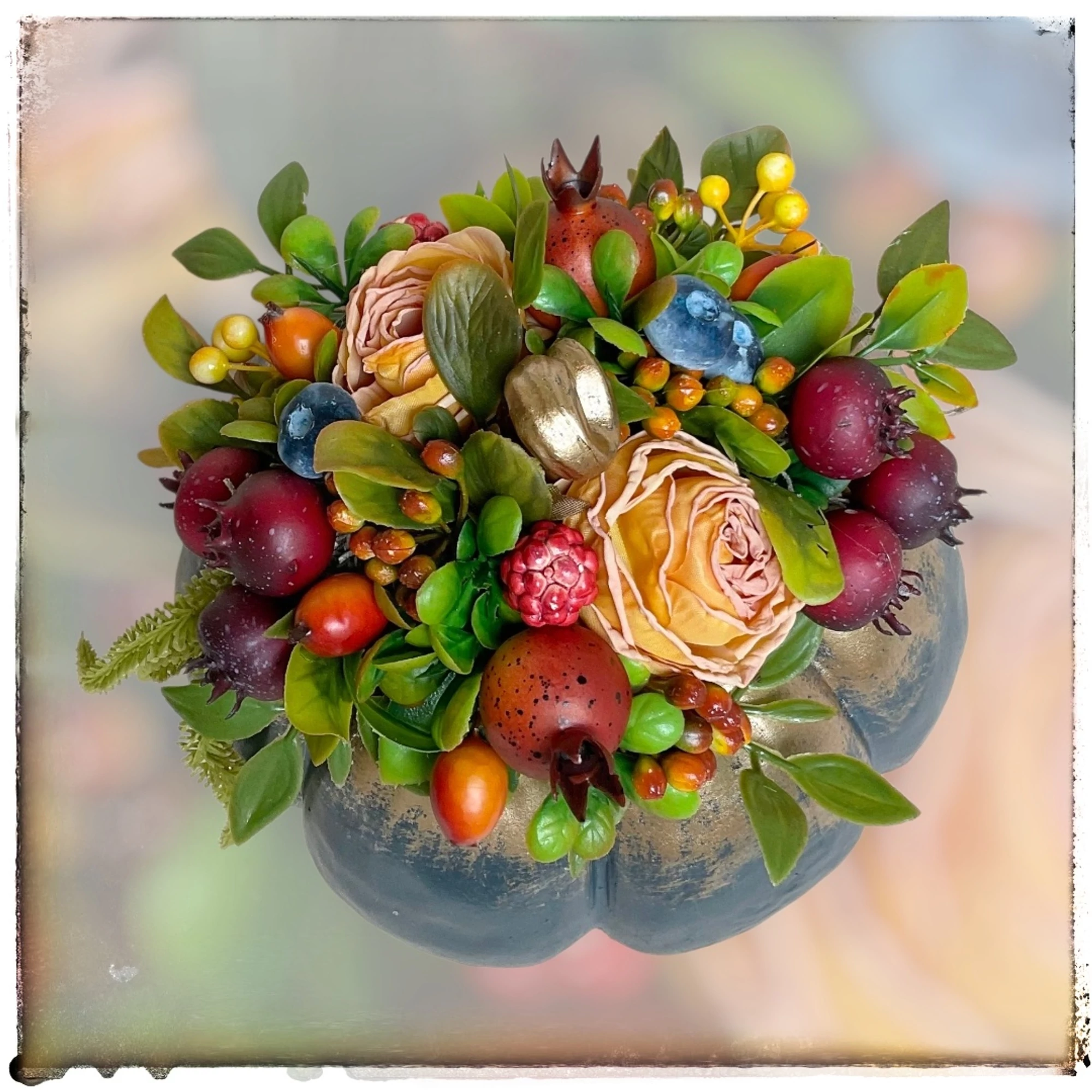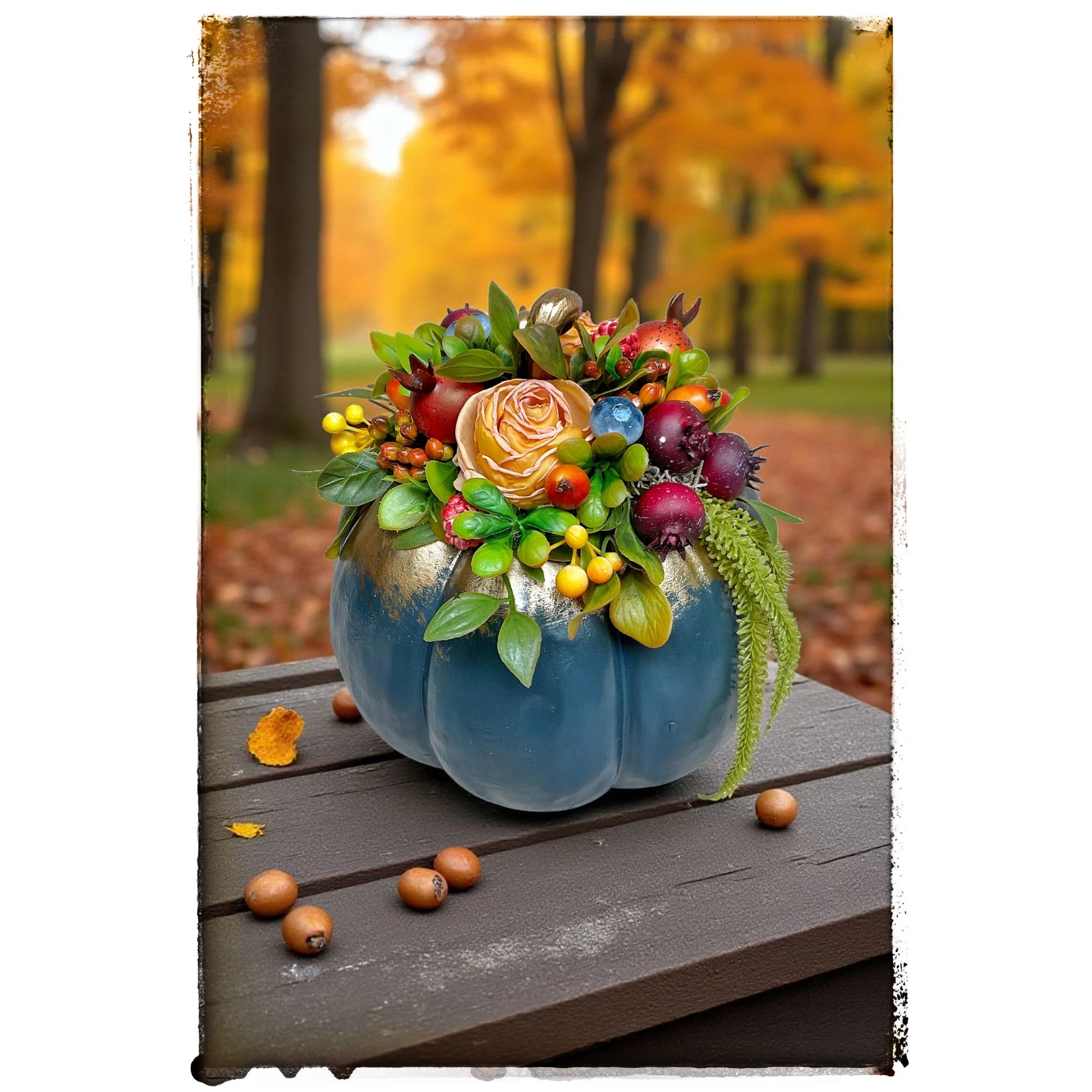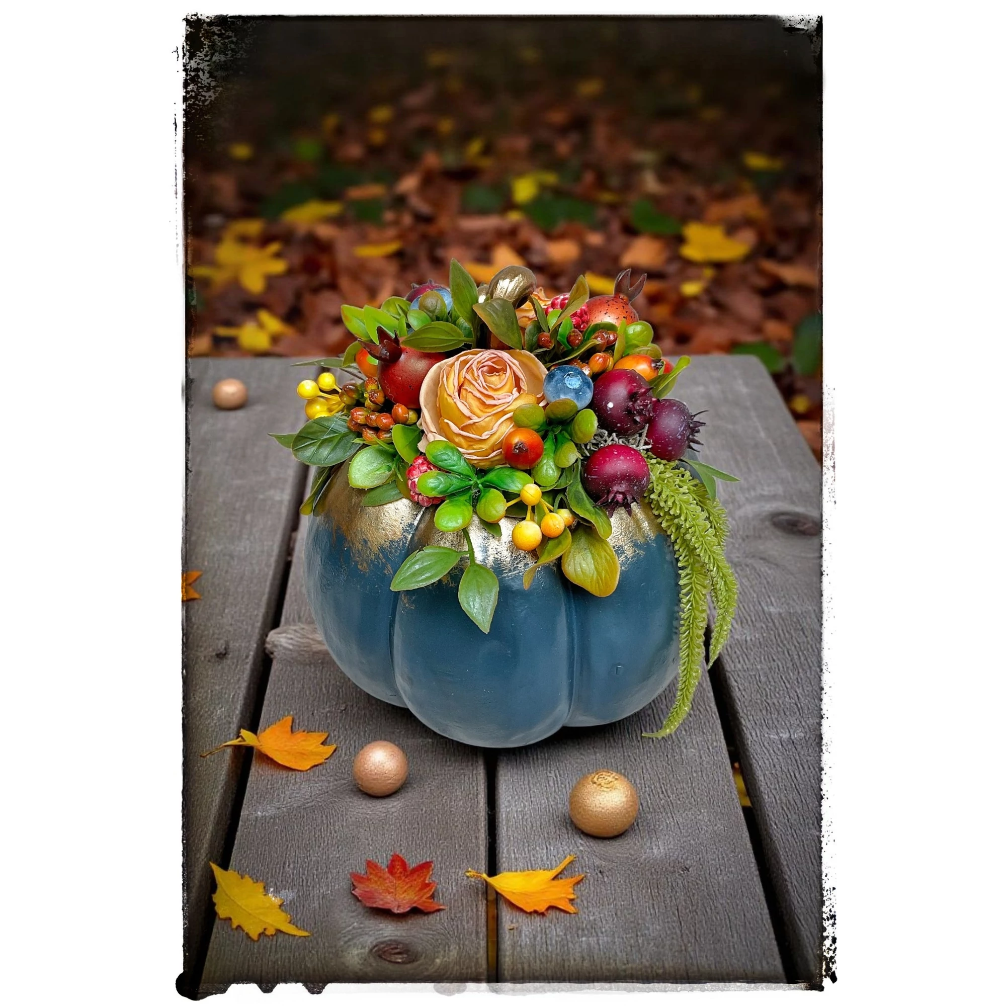 Ez az egyedi, kézzel készült dekoráció igazi éke lehet otthonodnak vagy irodádnak. Az elegáns sötétkék tök arany díszítéssel különleges megjelenést kölcsönöz, míg a gondosan válogatott, minőségi selyemvirágok és levelek harmonikus őszi hangulatot teremtenek.