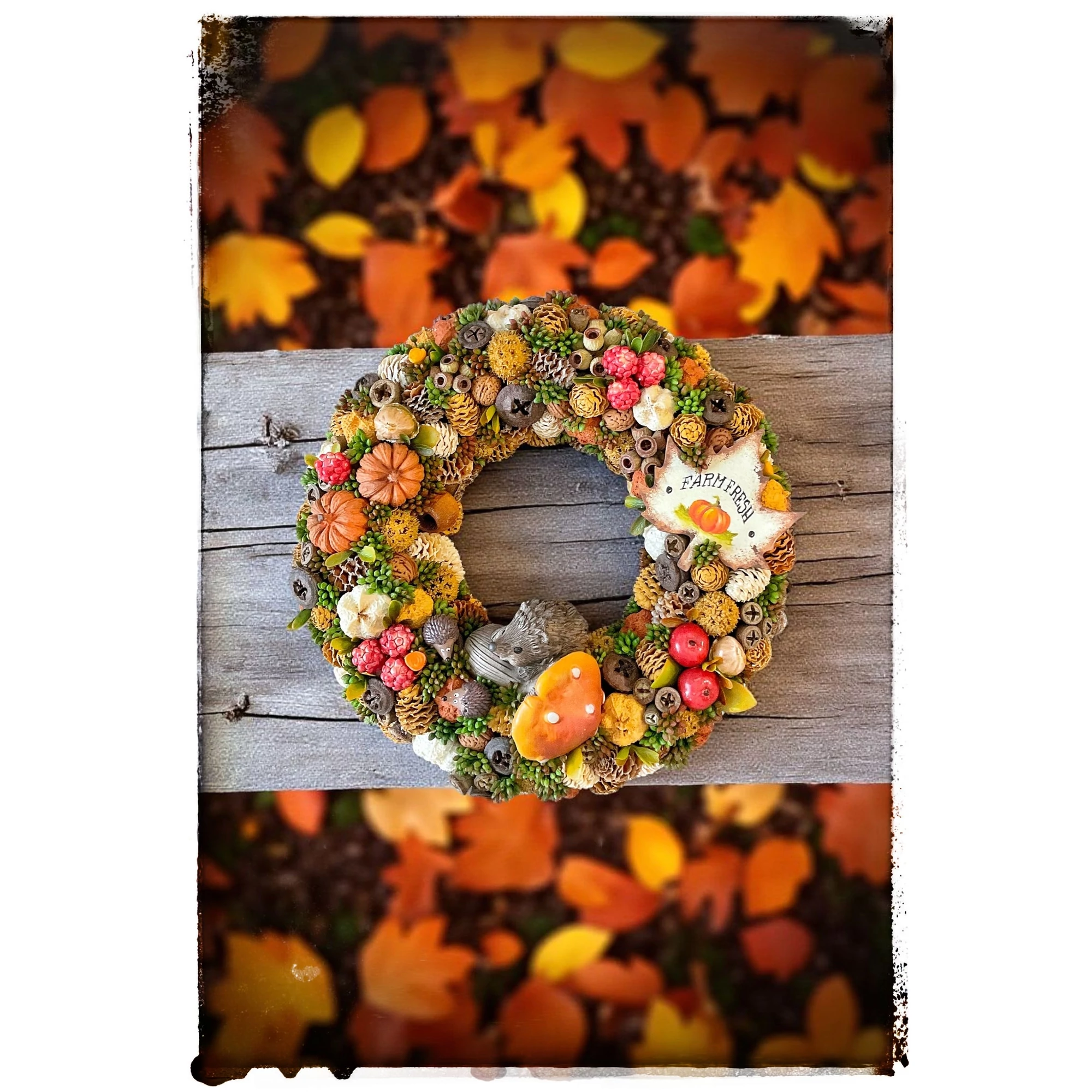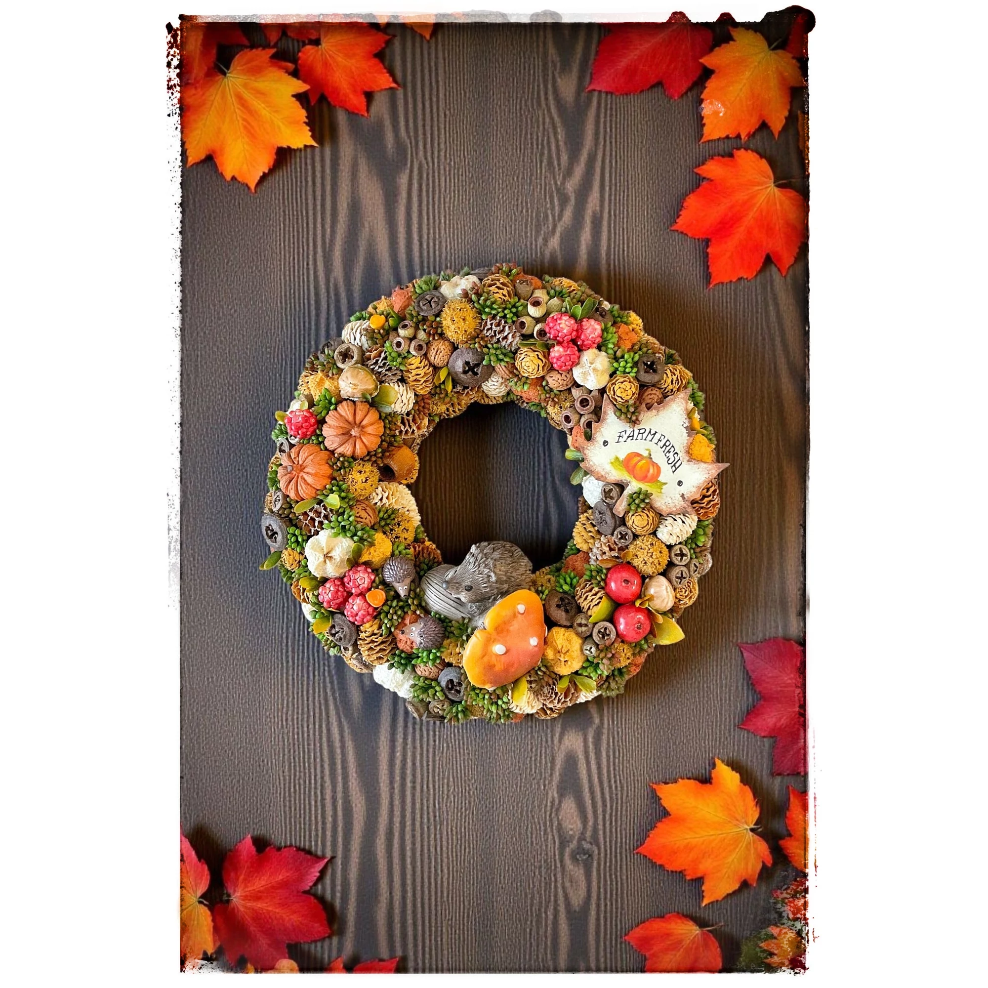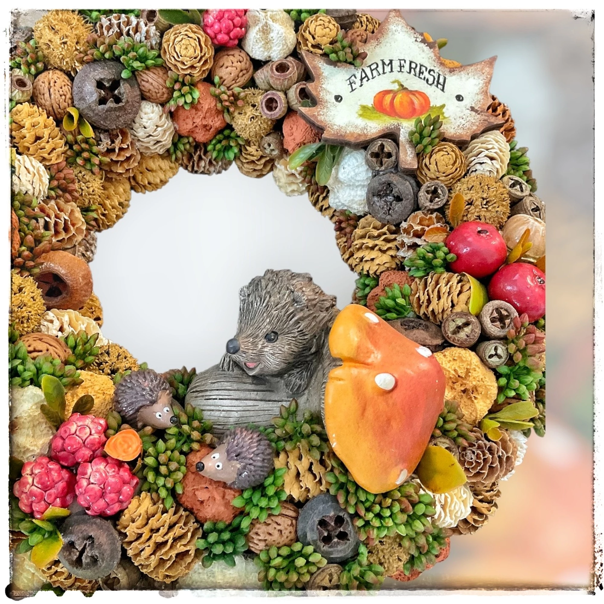 A koszorút vidám süni figura, valamint rengeteg őszi termény – piros almák, mogyorók, diók, apró dísztökök, tobozok és bogyók – díszítik. A kompozíciót egy kalligrafikus kézműves tábla teszi még különlegesebbé, amelyen a „Farm Fresh” felirat olvasható.
