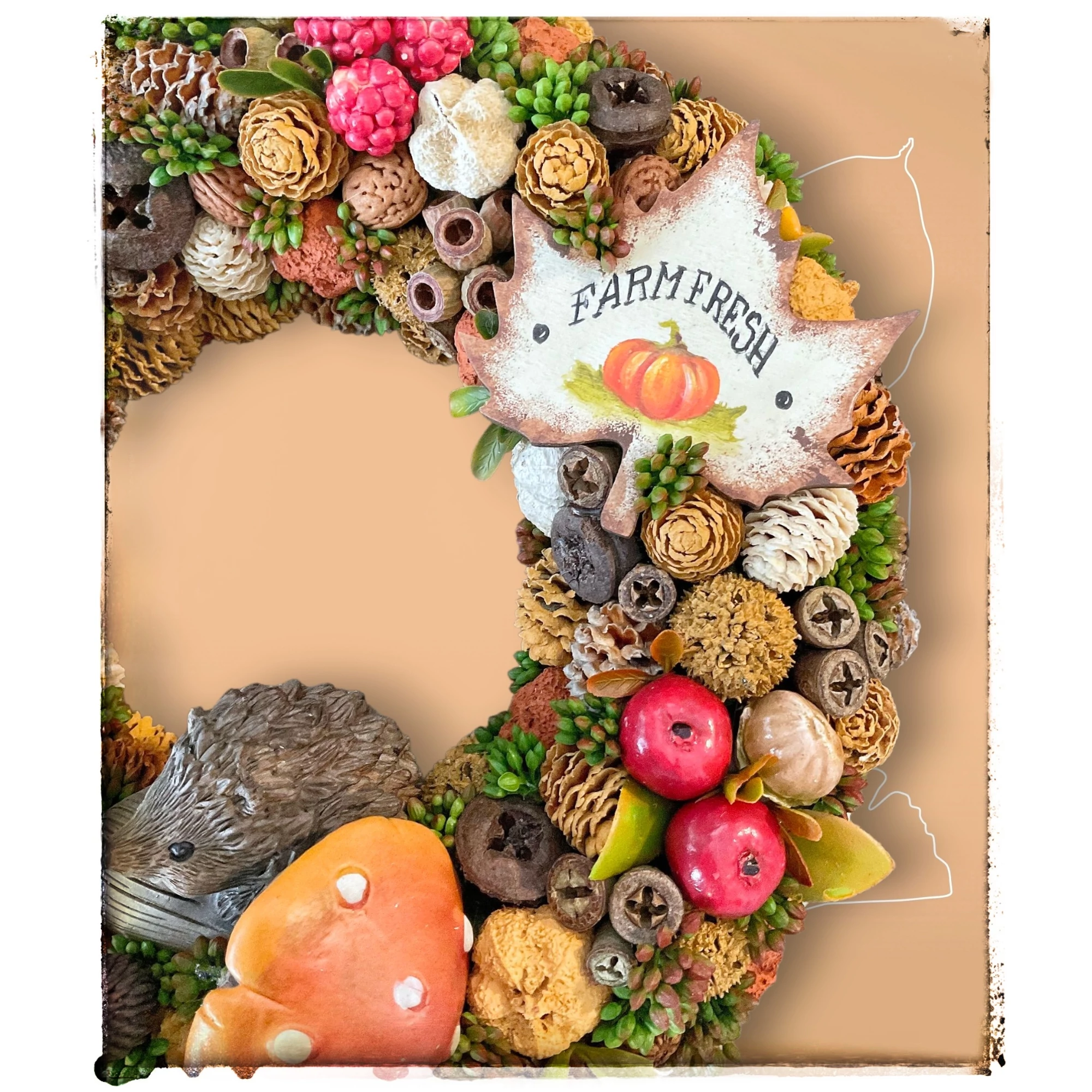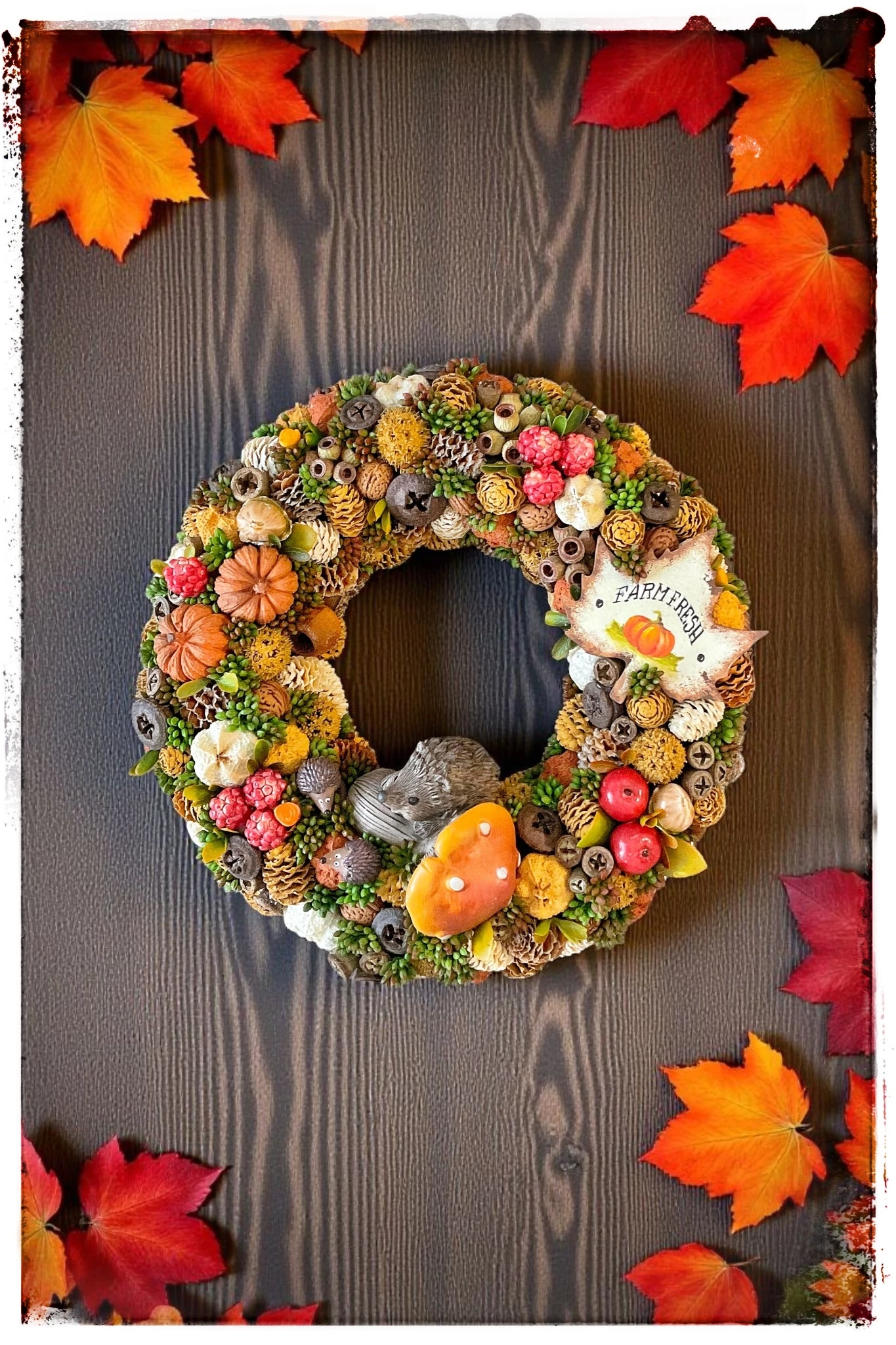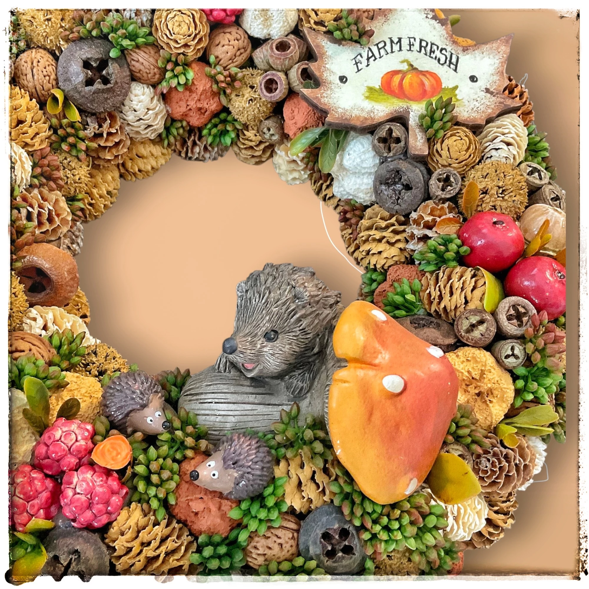 A koszorút vidám süni figura, valamint rengeteg őszi termény – piros almák, mogyorók, diók, apró dísztökök, tobozok és bogyók – díszítik. A kompozíciót egy kalligrafikus kézműves tábla teszi még különlegesebbé, amelyen a „Farm Fresh” felirat olvasható.