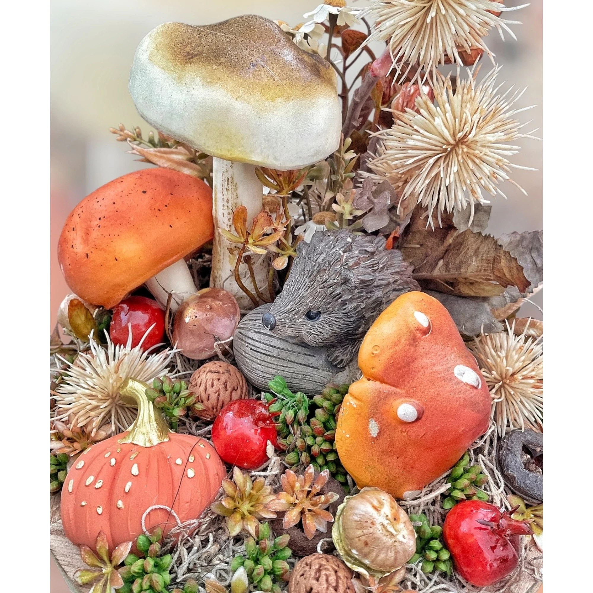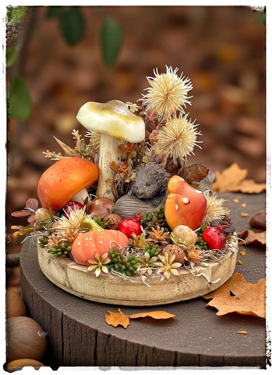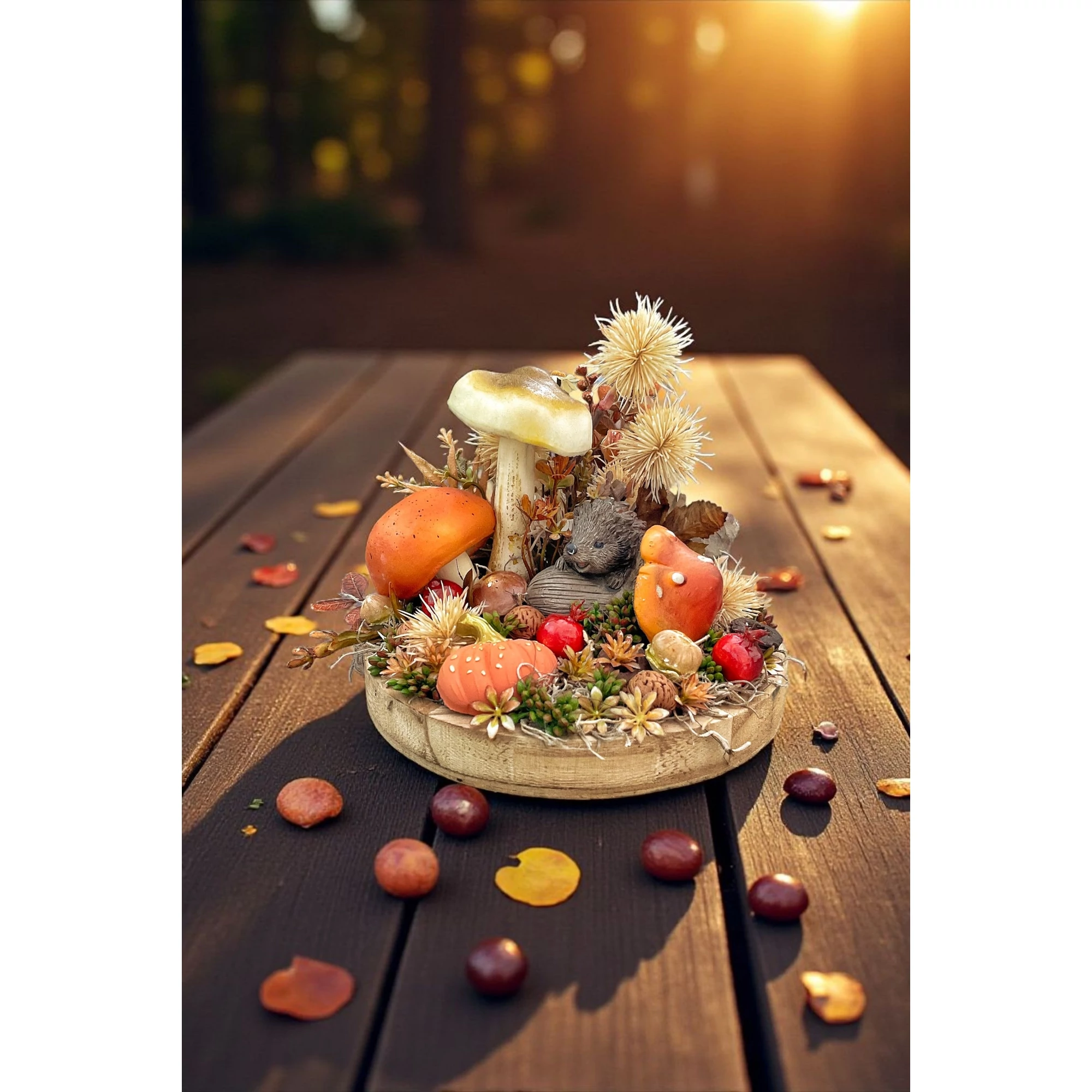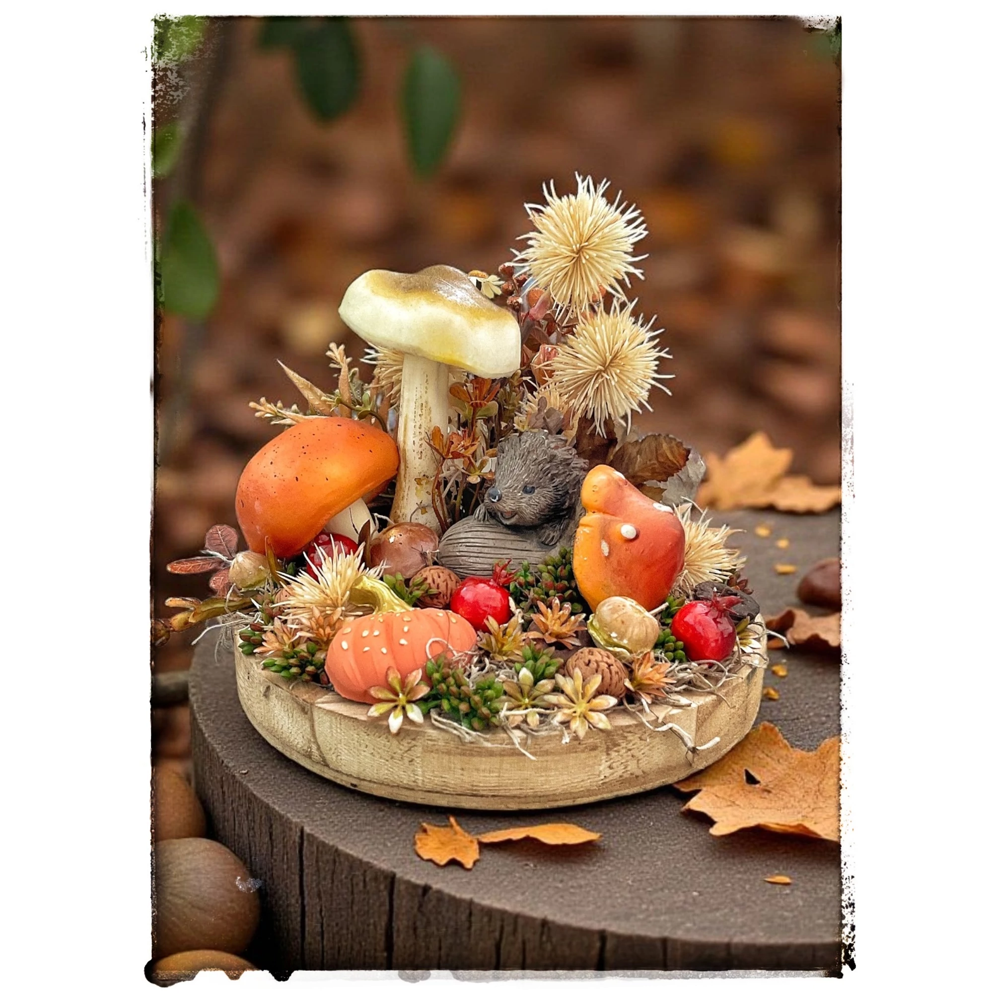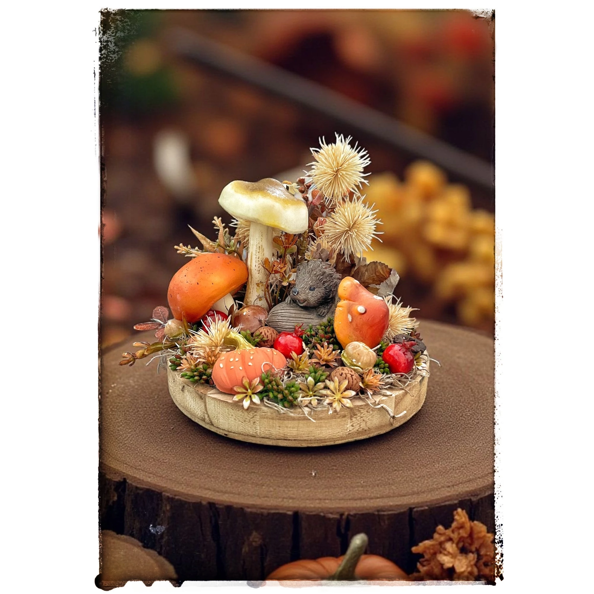 Fa tálcára készült őszi hangulatú asztaldísz tündéri sünis figurával, élethű gombákkal. Igazán kedves kis őszies hangulatot áraszt