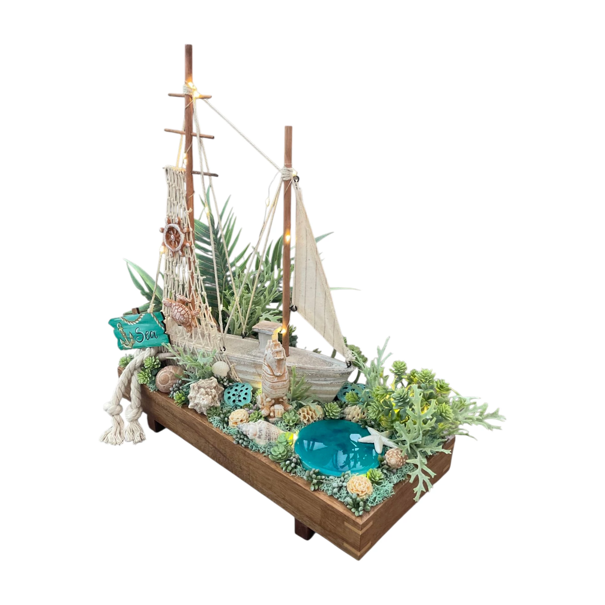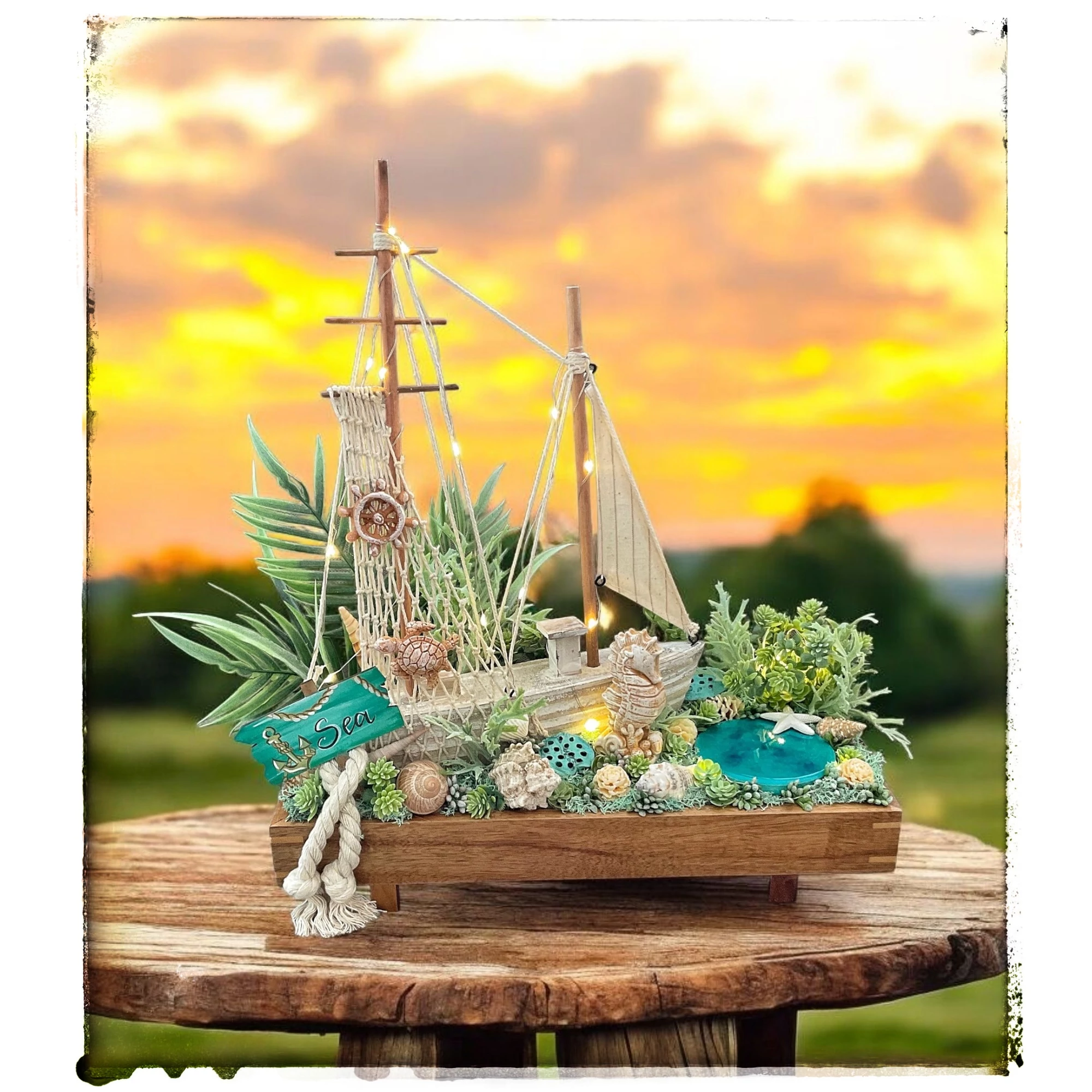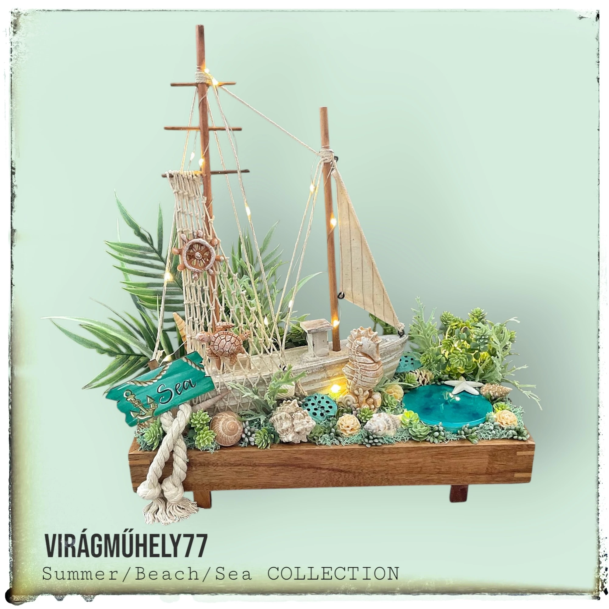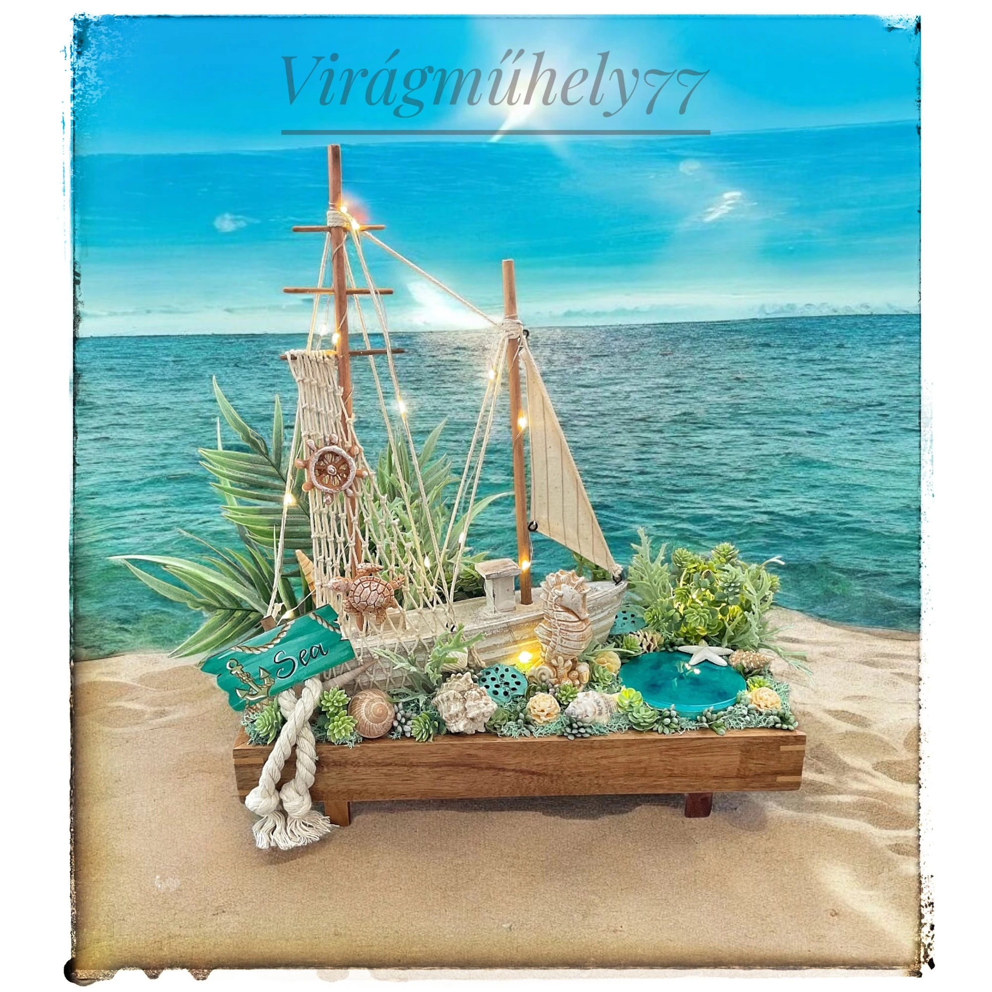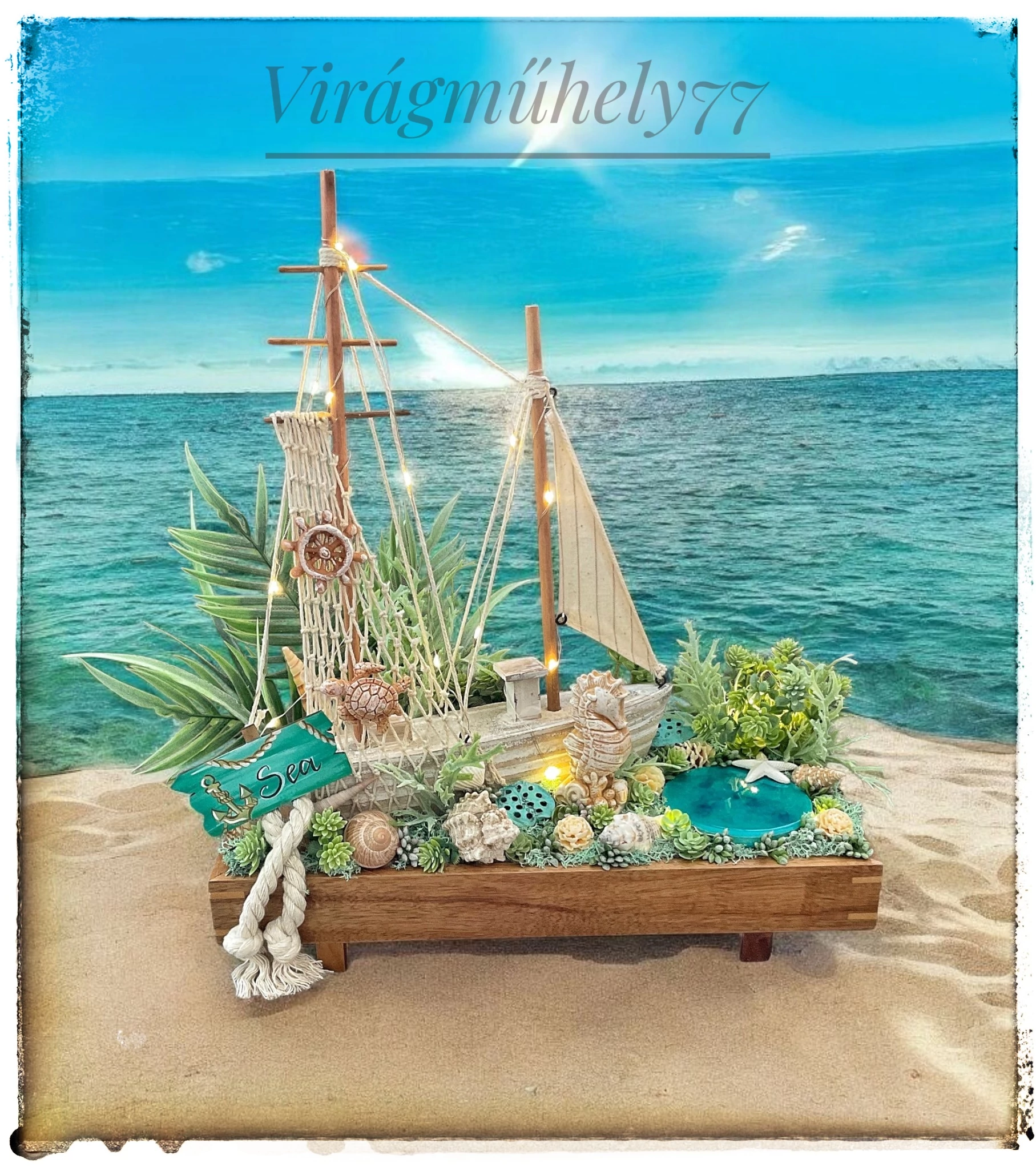 Fa tálcára készült nyári dekoráció, hatalmas vitorlás hajóval, kézműves táblával, illetve kézműves epoxy gyantából öntött vizet idéző formával. Került rá led vilagitás , sok kagyló és zöldek.