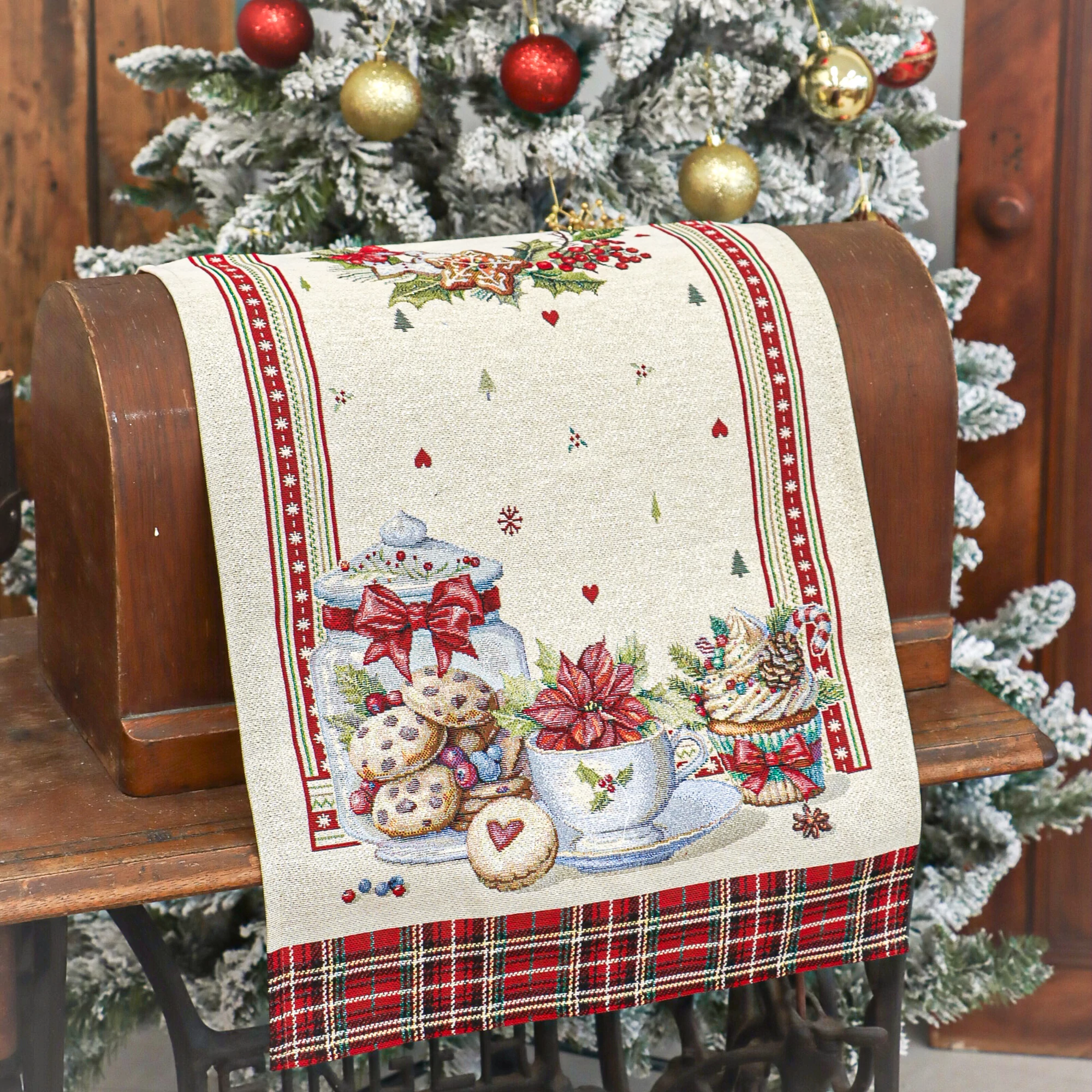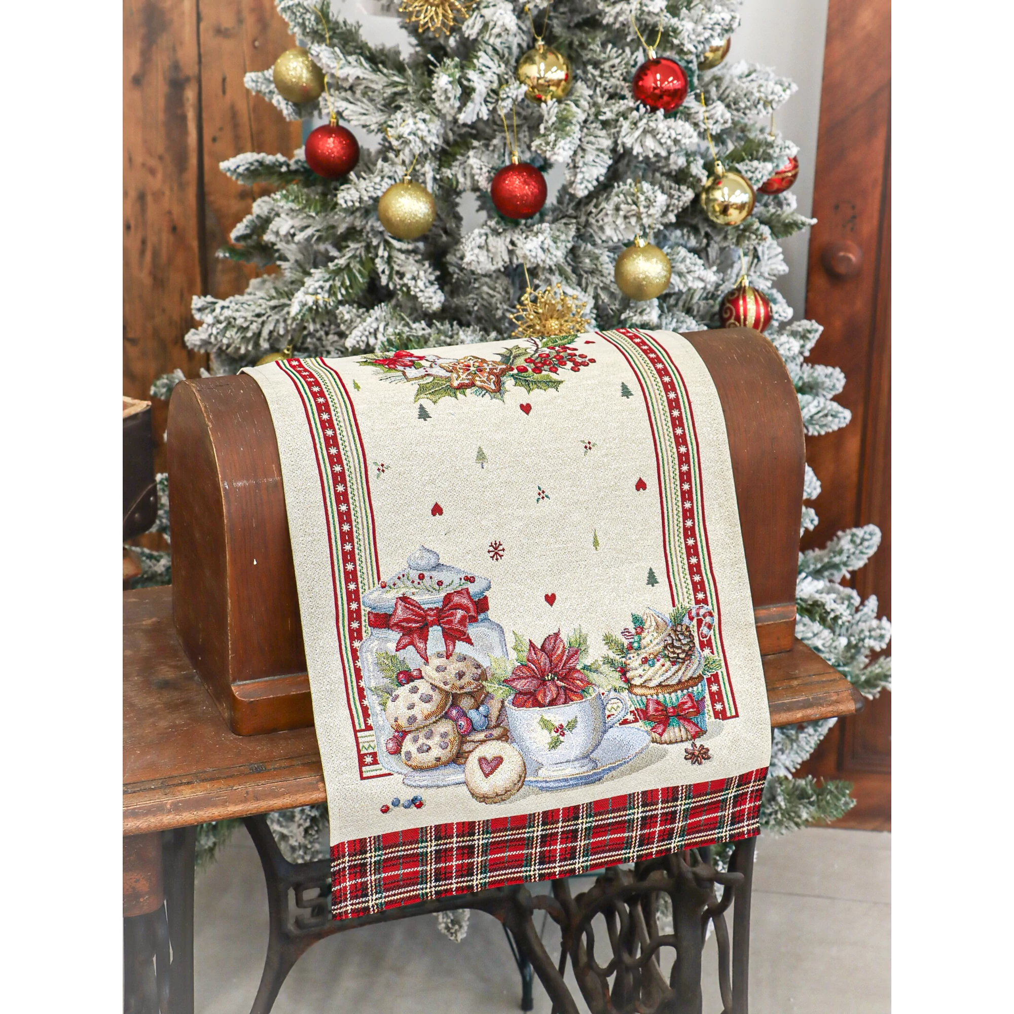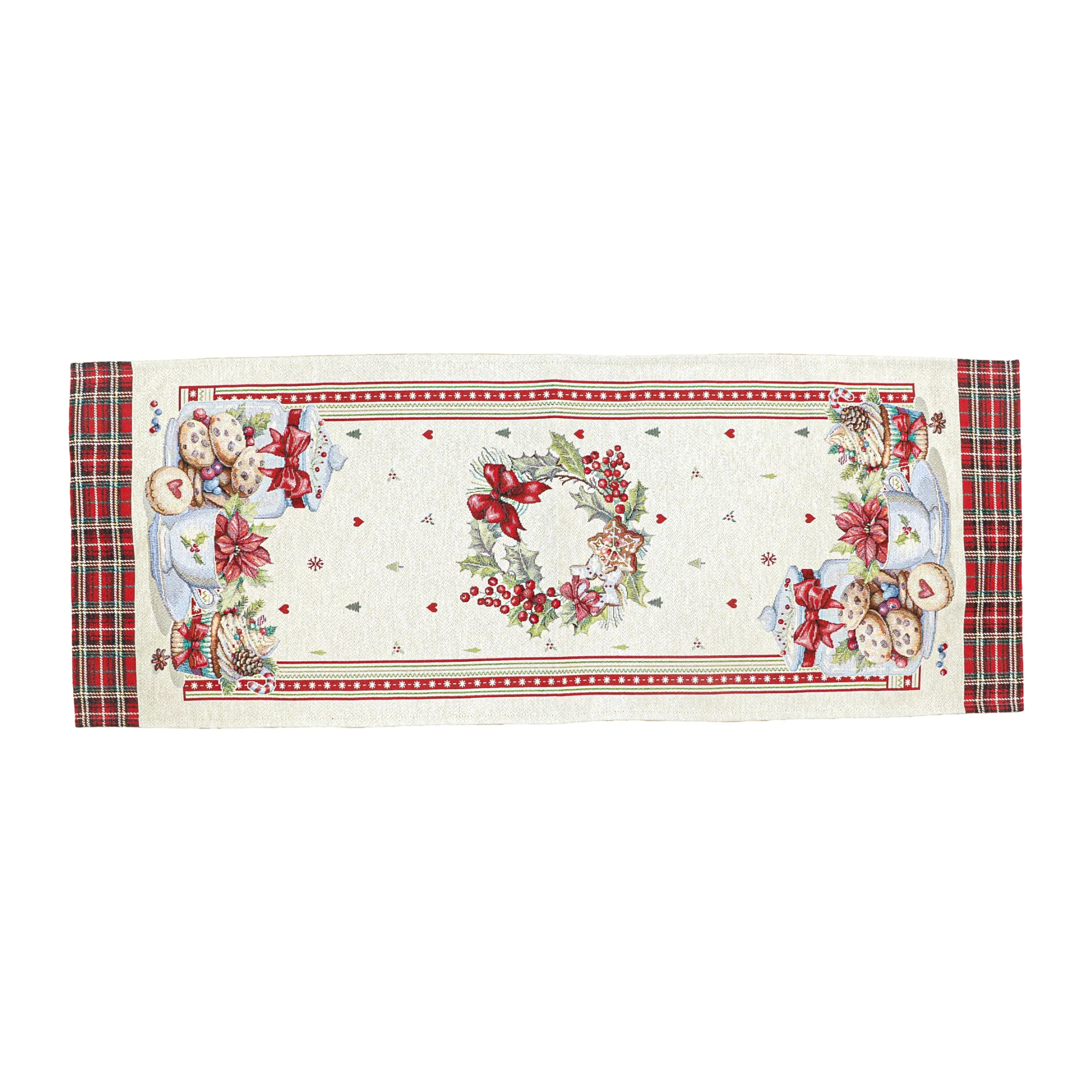 Varázsold ünnepivé az asztalterítést ezzel a különleges spanyol gobelin asztali futóval, amelyet fényesen csillogó ezüst lurex szálak tesznek igazán ünnepélyessé. A futó mintáján édes aprósütemények, muffinok, és egyéb ünnepi dekorok találhatók, a két végét pedig hagyományos skót minta díszíti. Az ezüst lurex szálak finoman megcsillannak a fényben, így különösen hangulatossá teszik a karácsonyi asztalt. Használható étkezőasztalon, komódon, dohányzóasztalon vagy ünnepi dekorációként bármely helyiségben.